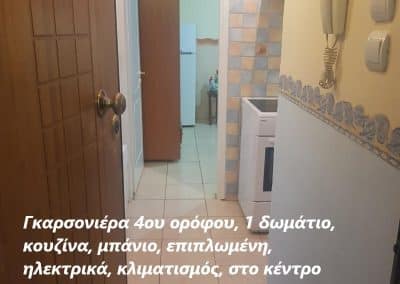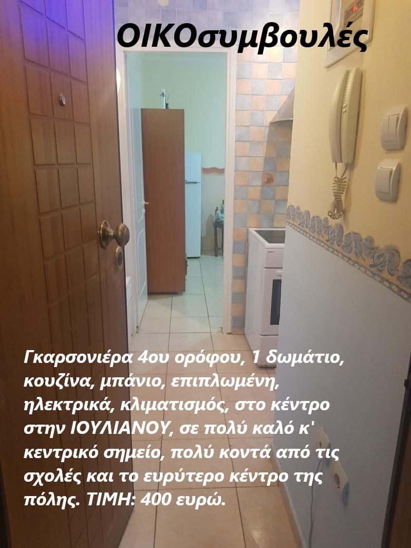 Γκαρσονιέρα 4ου ορόφου, 1 δωμάτιο, κουζίνα, μπάνιο, επιπλωμένη, ηλεκτρικά, κλιματισμός, πόρτα ασφαλείας, ασανσέρ, σε κεντρικό σημείο, πολύ κοντά από τις σχολές και το ευρύτερο κέντρο της πόλης. (αρχές Απριλίου διαθέσιμο)